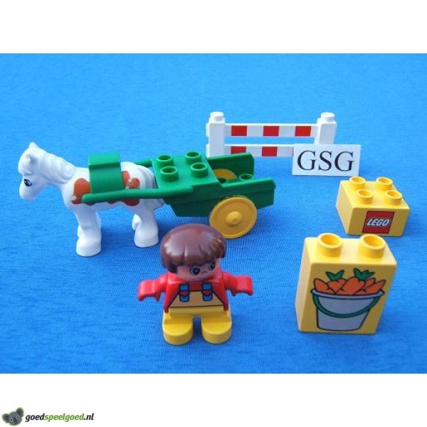 Setje bestaande uit een paard, kar, hek, eten, blok en een poppetje.