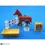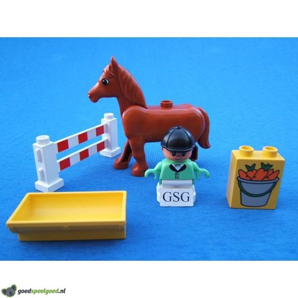 Setje bestaande uit een paard, hek, etensbak, voer en een poppetje.