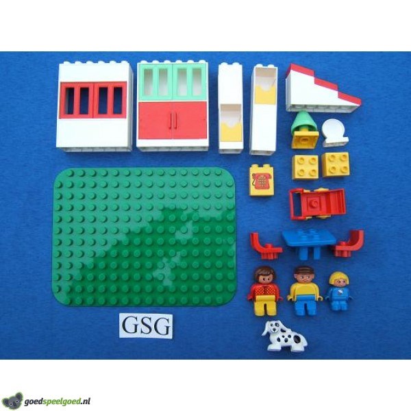 Deze 27-delige set bestaat uit: grondplaat, muurdeel met twee ramen, grote kast met 4 deuren, 2 boekenkasten met twee losse laatjes, dakdeel, lamp met standaard, spiegel, twee losse blokken, telefoon, wandelwagen, twee stoelen, tafel, papa, mama, kind en een hond. Alles is op te bouwen in vele variaties op de grondplaat.
