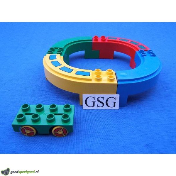 Klein gekleurd treinbaantje bestaande uit 4 segmenten en een wagon.