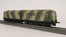 schaalsnelheid (75 km/u). 19 Functies: F0 lichten-F1 motor1-F2 starthoorn-F3 motor2-F4 voorverwarmer-F5 hoorn-F6 bediening-F7 ventilatoren-F8/F9 autolichten-F10 direct commando-F11 geen geluid-F12 Luchtklep -F13 veiligheid klep -F14 remsysteem lossen-F15 koppeling-F16 deur-F17 zandbak-F18 Conductor's fluitje-F19 gieren in bochten. De 9 4867 flatbeds: allemaal gespoten, elk met een gecamoufleerde tank en Artitec-accessoires. Perfecte werking (code 88).