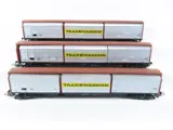 3x 4-assige schuifwandwagens met opdruk "Transwaggon", zilver/rood