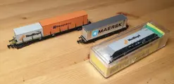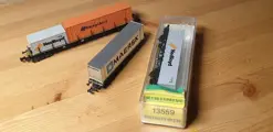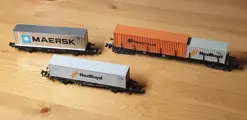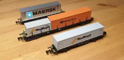 Eén wagon van Rivarossi (met Nedlloyd + Hapag-Lloyd containers erop), één wagon van Fleischmann (DB, met de Maersk container) en een wagon van Trix. Deze Trix 13559 (NS) wordt geleverd in de originele verpakking.