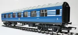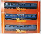 Drie fraaie Britse Hornby LMS Coronation Scot rijtuigen in de blauwe uitvoering met zilveren strepen van de Coronation Scot service. Dit type rijtuig werd, evenals de locomotieven, special voor deze dienst geproduceerd en reed vanaf 1937 in de speciale Coronation Scot passagierstreinen van Londen (Euston) naar Glasgow, Schotland.