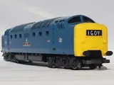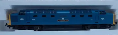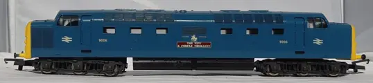 Diesellocomotief 'Deltic' serie 55 in blauwe kleurstelling van British Rail, bedrijfsnummer 9006 'The Fife and Forfar Yeomanry', getest en goed rijdend. In zeer goede staat, met alle koppelingen, decals en buffers aanwezig. Geleverd in vervangende doos in redelijke staat plus binnenverpakking.