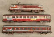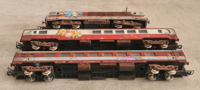Mooie en realistische TEE SNCF Franse Spoorwegen passagierstrein bestaande uit een vintage BB 15008 elektrische locomotief in rode en zilveren kleurstelling met twee passagiersrijtuigen, alle gemerkt Lima, Made in Italy, schaal H0 1:87, zonder originele doos.