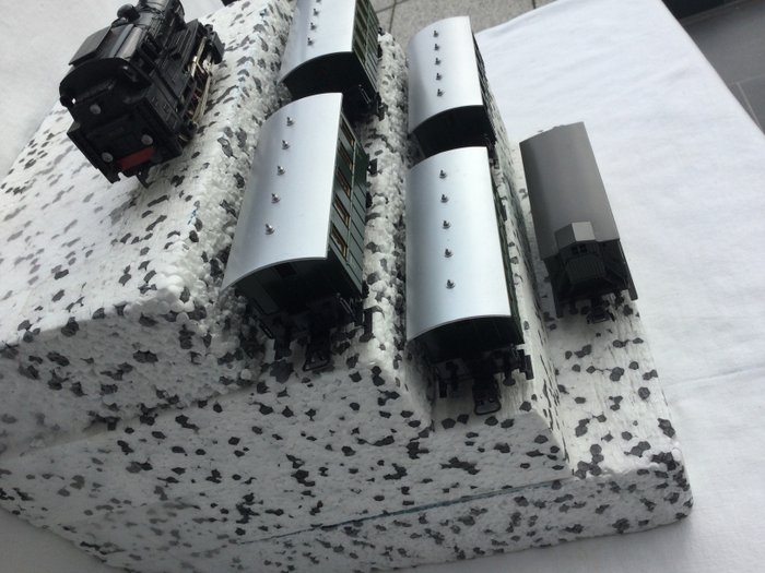 Prachtige treinset met een stoomlocomotief en 5 blikken personenrijtuigen in zeer goede staat.