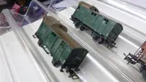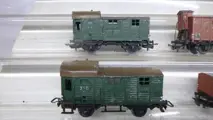 ca. 70 jaar oude gietijzeren en 1 blikken goederenwagon met speling en gebruikssporen leeftijdsgebonden nog in goede staat deels zeer goed,