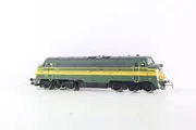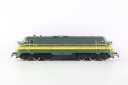 Zware NOHAB diesellocomotief in groen/gele kleurstelling van de Belgische spoorwegen (NMBS).