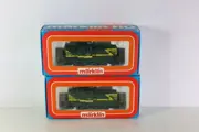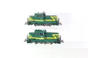 Groene loc met gele banen op zwart onderstel; rode bufferbalken.