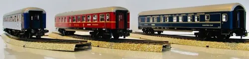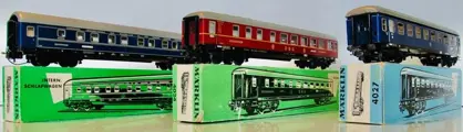 Märklin 4029, D-trein-slaapwagen, model van CIWL (Wagon-Lits), metaal, 4-assig, blauw, grijs rond dak, opschrift "INTERNATIONALE SCHLAFWAGEN-GESELLSCHAFT", versie 1 (ramen met plastic ruiten en zilveren dak), bouwjaren 1960-1963,. Voorzien van binnenverlichting (2 Märklin wagenverlichting nr. 7077 en Märklin sleepcontact nr. 7198). Lengte 24 cm.