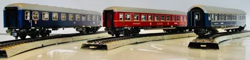 Märklin 4027, D-trein-rijtuig, DB, metaal, 4-assig, blauw, dak grijs, 1e klasse, versie 3 (ingezette ramen met zilveren rand en het opschrift A4üm), bouwjaren 1964-1970, interieur (Märklin nr. 0225) met 10 figuren (Märklin nr. 0226.2) . Voorzien van binnenverlichting (2 Märklin wagenverlichting nr. 7077 en sleepcontact nr. 7198). Lengte 24 cm.