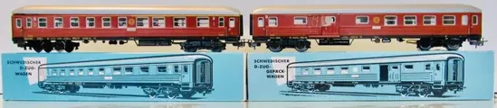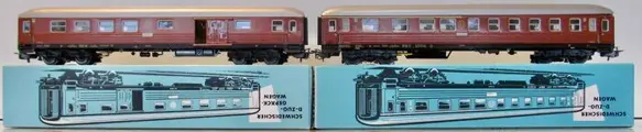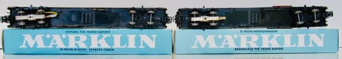 Märklin 4030, D-trein-rijtuig, SJ (Zweedse Spoorwegen), metaal, 4-assig, bruin, dak grijs, SJ-vignet, bouwjaren 1960-1967, 1e en 2e klas, met interieur (Märklin nr. 0225) en figuren (Märklin nr. 0226.2). Voorzien van binnenverlichting (2x Märklin wagenverlichting nr. 7077 en sleepcontact nr. 7198). Lengte: 24 cm.