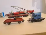 Ik bied hier 13 goederenwagens aan. Van de 4413 is er maar één originele doos. Op het zijspan voor de kraan is een plekje geplakt, dat is nog te zien, zie foto's. Alle anderen zijn in goede gebruikte staat volgens leeftijd zonder breuken. De kraan is volledig functioneel.