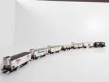 Wagons verkeren in nieuwstaat, geen (lak-)beschadigingen in onberispelijke ovp. zie m.n. de volkomen blanke asjes en wielloopvlakken, vermoedelijk nooit op de baan geweest.