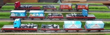 Kavel bestaande uit 12 lageboordwagens beladen met vrachtwagens en compleet met haken, assen en buffers
