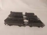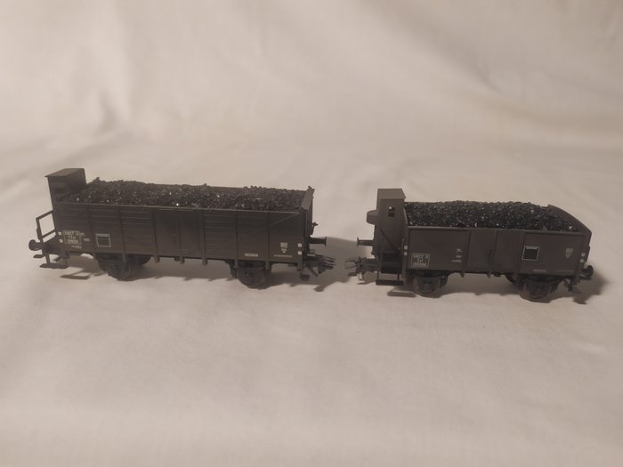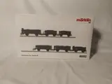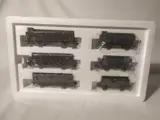 6 wagons waarvan 2 met remmershuis, 2 alleen met remmersbordes en 2 zonder remmersbordes en zonder remmershuis. Verschillende gangenborden. Gepatineerde wagoncarrosserieën. Laadinzetstukken met echte houtskoolcoating. Totale lengte h.t. 49,6 cm