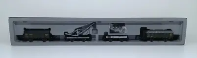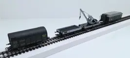 Eenmalige Speciale uitgave in samenwerking met Trix . Hoge bord wagen met remmershuis en zeil afdekking grijs . Afgedekte hoge bord wagen (Turf wagen ), met zwart dak . Kraanwagen grijs en kraan bescherm wagen .,zakjemet bijbehorende onderdelen . Set is compleet en origineel en in super mooie conditie .Het product is in nieuwstaat zonder mankementen en heeft geen lakschade. Nauwelijks gereden, zie de asjes. Alles is recentelijk getest engesmeerd 100% werkend.