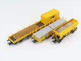 Drie verschillende goederenwagens van de Deutsche Bahn Gleisbau GmbH (DBG). Tweeassige rongenwagen type Kbs, een vierassige rongenwagen type Res van het Europese standaardtype met een lengte van 19,90 m, en een draaischuif-zijlosser Fcs. Plausibele vormgeving die bij het tijdperk past.