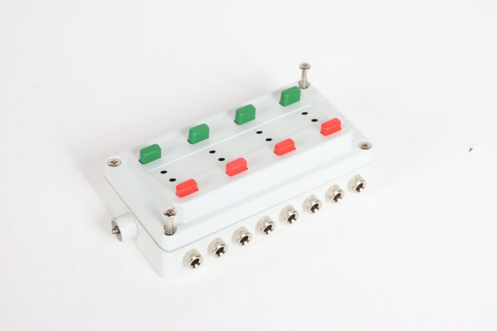 Kavel met tien wisselschakelaars. Moderne versie met vierkante knopjes. Goed functionerend. In goede staat (verkleurd) tot bijna nieuwstaat. Bekijk de foto’s aandachtig.