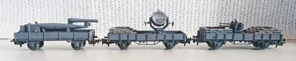 Spoorvervoer van een V1-raket, een luchtafweerzoeklicht en een viervoudig luchtafweerkanon.