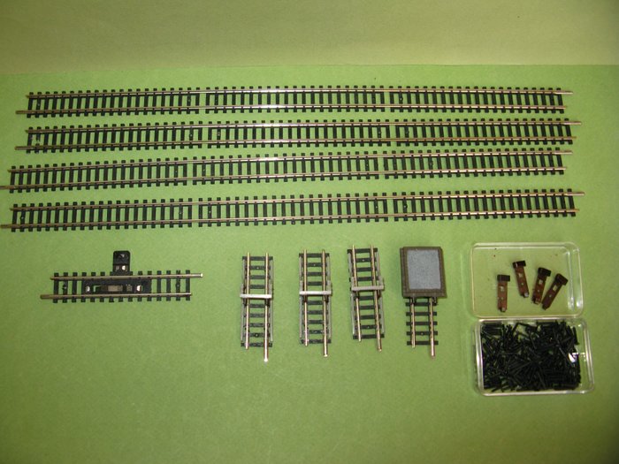 De sporen met een bruin rekje rond zijn sporen komende van een spoorbaan, merendeel zijn vastgeschroefd geweest en bij een aantal daarvan is een draadje aan vast gesoldeerd geweest (zie foto's). De rails verkeren in goede staat dus geen lijm of verfresten en al zeker geen roest.