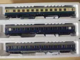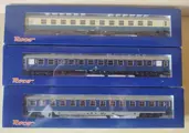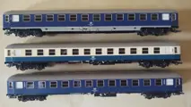 Drie couchette rijtuigen van de DB uit de jaren '70 en '80, zoals destijds in heel Europa ingezet. Door Roco uitgegeven als set. De rijtuigen beschikken over kortkoppeling, voorzien van interieur en zijn voorbereid op de inbouw van binnen verlichting (stroomafname).