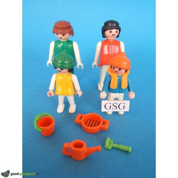 Gezin bestaande uit vader, moeder en twee kinderen helemaal uitgedost voor het strand met schepje, harkje, emmer en zeef..