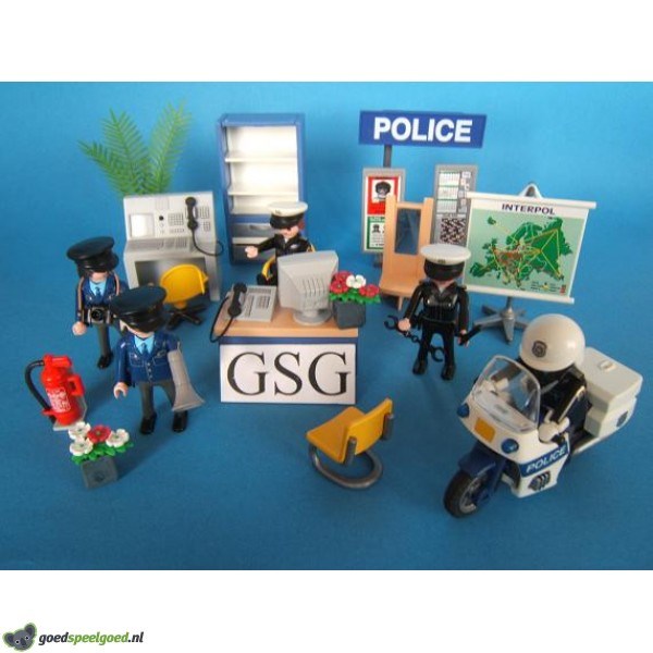 Politiebureau set bestaande uit vijf agenten met veel accessoires zoals een motor en meubilair en nog veel meer kleine dingetjes.