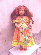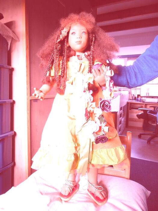 De pop zat bij ons thuis bij andere poppen op een plank. Er is niet mee gespeeld.