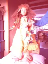 Betreft een in een mooie jurk aangeklede pop met Rastahaar en is geheel origineel, compleet zoals op de foto. Hoogte pop 78 cm. De pop is gesigneerd door Annette Hemstedt onder aan een sandaaltje en op haar rug. De pop is vervaardigd in Duitsland. Serie 1013 PKII 2000. Is twee jaar geleden gekocht in de winkel Intertoys in Bussum zonder doos.Er was geen certificaat bij. Aldaar waren zij de collectie aan designpoppen aan het verkopen in verband met de verbouwing van de winkel. Van de pop Amber was nog 1 exemplaar en die stond in een vitrine.