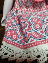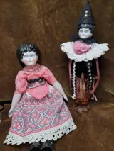 Met antieke stoffen en in oude stijl zijn deze 2 handgemaakt. Het popje is 40 cm. Ze heeft een prachtig geborduurd jurkjeen onderjurkje aan, afgewerkt met oude organza en zijden band. De handgemaakte Marrot is 30cm. Er zijn allerlei oude stoffen en lint in vverwerkt en ook de belletjes ontbreken niet. Ze worden goed verpakt en aangetekend verzonden.