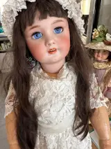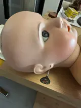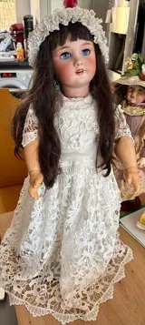 pop in perfecte staat oorgaatjes open mond natuurlijke pruik hoofd in perfecte staat zonder barsten ze draagt een erg mooie jurk ze is 68 cm lang