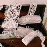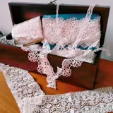 - Een grote houten kist vol vintage kant ter verfraaiing van poppenkleertjes of voor andere creatieve ideeën. Het dateertuit het begin van de XXe Eeuw, er is klos- en lintkant met prachtige motieven.