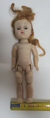 1955-1956 Vogue Doll Ginny, 20 cm lang, hard plastic, geleed lichaam, hoofd werkt met benen, ogen dicht bij liggen, voorgevormde wimpers, mond gesloten, hoofd gemerkt: Ginny Vogue Dolls, Inc., Body gemerkt: Vogue Dolls Inc , Pat. 2687594, gemaakt in de VS.