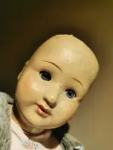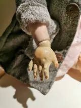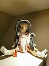 Deze pop is in ieder geval wel zeer decoratief en lijkt gemaakt van Papier Machee. De armen en gewrichten kunnen allemaal bewegen waardoor de pop kan zitten of staan. Als de pop neergelegd wordt gaan de ogen automatisch dicht.