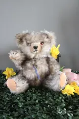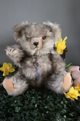 Teddybeer Jopje, zoals ik hem noem,vergezelt mij al heel lang. Deze kleine beer van 30cm werd door Hermann gemaakt. Maar als kind trek je de labels er wel van af. Mooi gespitzt mohair. De beer is in redelijke toestand. Alleen de bronstem doet het soms wel en soms niet,. Gespitzt mohair is tweekleurig mohair waarvan de punten van eht mohair anders van kleur zijn dan de basis.