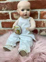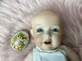 J.D.K babydollby Madein 14 , gemarkeerd : Germany Ges.Gesch. J.D.K 237 / 1070 W , dit is een mooie reproduktie , volledig in biscuit , gezichtje handgeschilderd, open mondje met 2 tandjes , blauwe open oogjes , ze is in goede staat32 cm groot. Ze komt naar jou toe met een roze kleedje en bijpassend hoedje- ondergoed, kousjes- en schoentjes , extra: een metalen paaseitje.