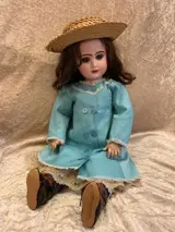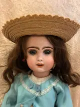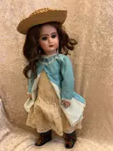 Franse Jumeau pop Gaaf bisque hoofd , gemerkt : 8 , vaste geblazen blauwe ogen, open mondje met tandjes, doorboorde oorgaatjesGeleed frans compositie lichaam (ouderdomsschade aan rechter onderarm en handje + in lichtere mate aan linkerhandje Oud ondergoed, oud onderjurkje (heeft wat ouderdomsvlekjes) met mooie strook kant aan de onderzijde , romantisch jasje Oude pruik en rieten hoedje , kousjes en fraaie oude laarsjes