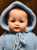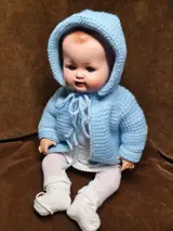Deze guitige baby heeft een mooie uitstraling met blauwe glazen slaapogen. Het lijf is van stof, opgevuld met stro en mooie armen en benen. Een paar gebruikssporen, masr niet storend. Ze draagt een wit katoenen babytruitje, wit broekje en witte sokjeseen blauw jasje met bijpassend los mutsje. Een mooie aanwinst voor uw verzameling. Ze wordt zorgvuldig verpakt en aangetekend verzonden.