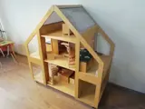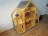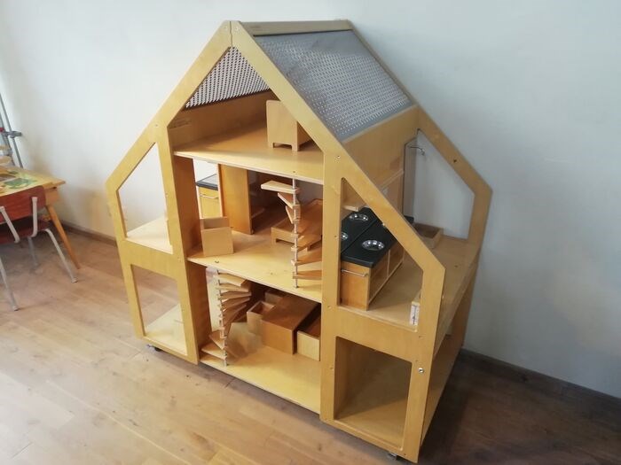 De Rolls Royce onder de poppenhuizen (Poppenvilla Liliane) dit prachtige grote handgemaakte houten poppenhuis compleet ingericht met mooie originele handgemaakte houten meubelen, voor de keuken, woonkamer, slaapkamers, badkamer, entree etc. Op 4 wielen met rem voor gemakkelijke verplaatsing. In zeer goede staat, enkele onderdelen (zoals de kranen op het keukenblok) ontbreken. Met indrukwekkende afmetingen: 128 x 120 x 6,5 cm (h x b x d).