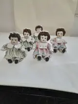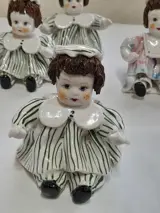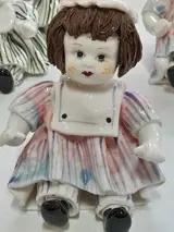 Miniatuur van 5 figuurpoppen voor kinderen van Lino Zampiva handgemaakt spaghettihaar gemaakt in porselein, met de hand gedecoreerd de poppen hebben allemaal een ander gezicht elke pop weegt ongeveer 400 gram totaal 2000 gram, de afmetingen van elke pop en van hoogte 11 cm breed 8 cm sommige en bredere lengte ongeveer 10 zeer goed gedecoreerd zeer glanzend de poppen vertegenwoordigen kinderen in de kleuterklas