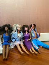 Grote verzameling Barbies uit de jaren 80. Er zijn 7 Barbies met verschillende afwerkingen en een ken. Presenteer originele kleding en kleding voor de verandering van kleding van de Barbies.