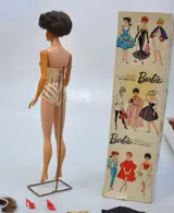 Een vintage barbie / Midge pop. Gemerkt en gedateerd 1958. Onder het voetje "Japan" Helaas is het hoofdje verkleurd en heeft vlekjes, ook plakt het. De doos mist een kant van het deksel, zie foto.