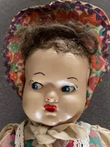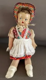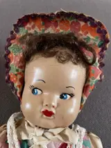 Stoffen popje met hoofdje van papier mache. Ledematen zijn bevestigd met metalen pinnen, deze zijn wat verroest. Jaartal niet bekend, popje oogt wel erg oud. Lief en schattig gezichtje, beschilderd.