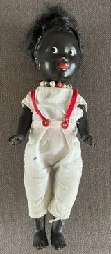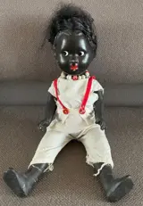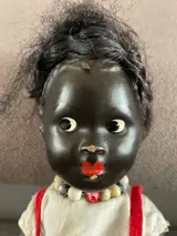 Donder popje van licht materiaal (papier mache?), beschilderd gezichtje. Voorzien van houten kralenketting en licht gekleurd pakje. Verf hier en daar gebarsten en sprake van chips op paar plekken. Desondanks bijzonder popje.