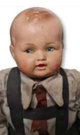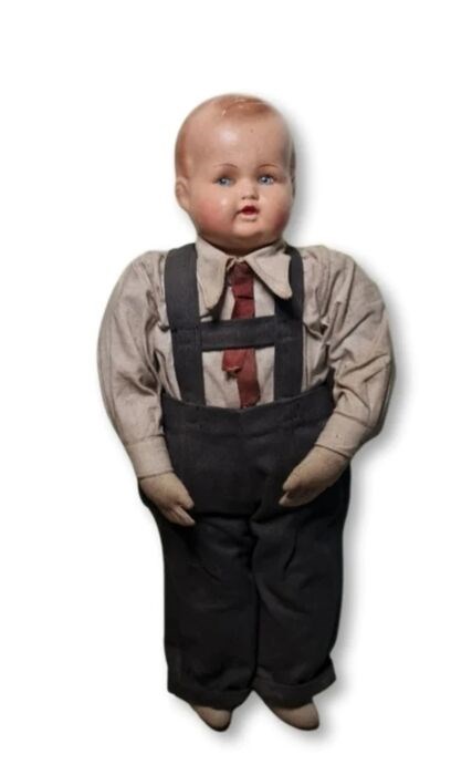 Kleine jongen met blauwe ogen, hij heeft een zeer goed getekend gezicht, daterend uit de jaren 1900, het lichaam is van stof of stro, te zien tijdens de restauratie. Zeldzaam stuk dat ons in de oude tijd onderdompelt, het zal liefhebbers bekoren.