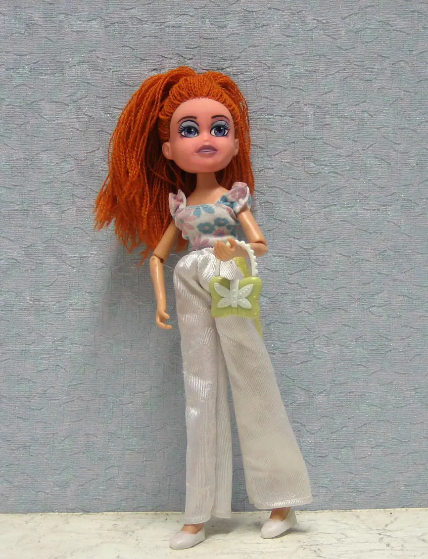 popje met wol haar en ze heeft leuke tas erbij.