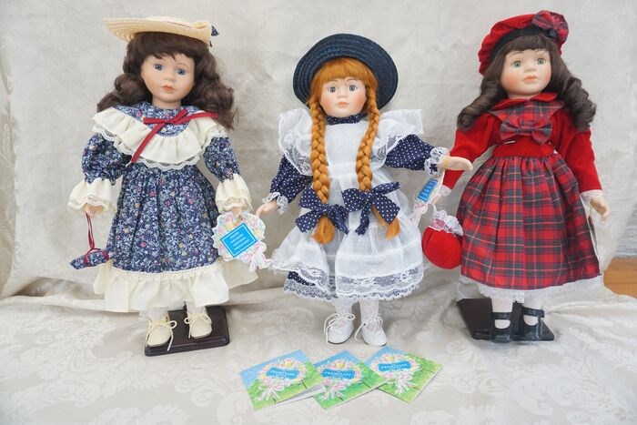 Drie poppen van de Promenade collectie , Imogen- Beatrice en Charlotte , in originele doos , Stempel en naam in de hals van de poppen , 2 originele standaards , ze zijn enkel uit de doos geweest voor de foto's. Worden goed verpakt en verzonden via Dpd of postnl .