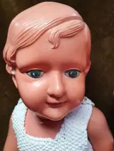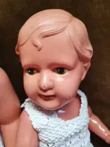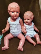 Deze 2 leuke poppen van licht celluloid materiaal hebben al bijna 100 jaar overleefd. Ze zijn mooi gaaf gebleven. Je kunt ze zowel als jongen, maar ook als meisje kleden. De grote is 65cm en de kleinere is 45cm. Ze dragen beiden een handgebreid stelletjenaar oud model.